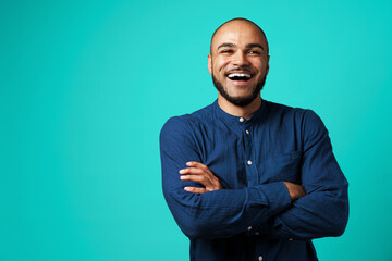 A young man with curly hair and a beard smiling confidently while looking to the side against a plain background. showcasing a relaxed and approachable demeanor suitable for lifestyle imagery