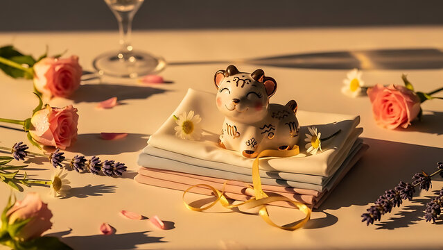 A charming kawaii Japanese scene featuring two small ceramic zodiac horse figurines with rounded shapes and adorable expressions, decorated with pink floral motifs and soft red accents.