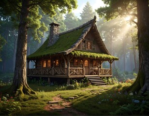 Rustic cabin in lush green forest with sunlight filtering through trees