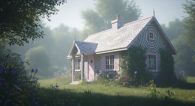 A quaint, pastel-colored cottage nestled in a misty forest clearing.