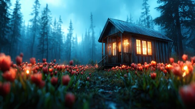 A charming wooden cabin nestled among blooming tulips in a misty forest, creating a serene and picturesque scene that encapsulates the beauty of nature and tranquility.
