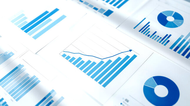 Many charts and graphs. Reflection light and flare. Concept image of data gathering. various business charts and graphs printed on a bright white paper. The documents feature blue bar graphs