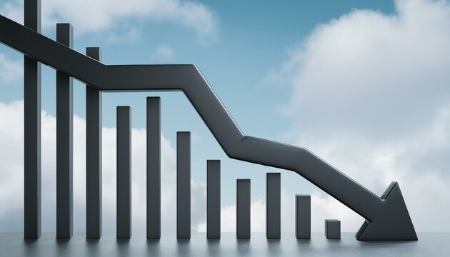 Blue 3d bar graph showing a sharp downward trend with an arrow indicating decline