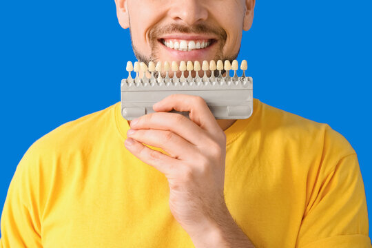 Man with teeth color chart on blue background, closeup