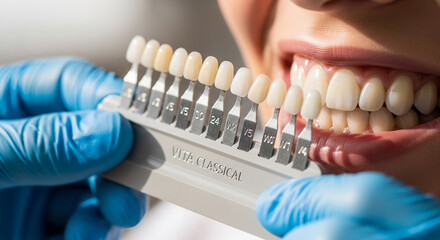 Closeup dentist using tooth color chart to match the shade patients natural teeth