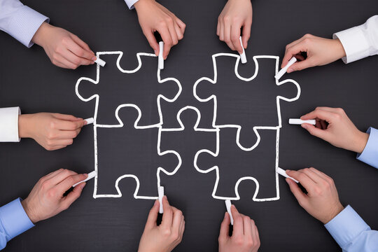 Wooden figurines holding jigsaw puzzle piece collaboration image