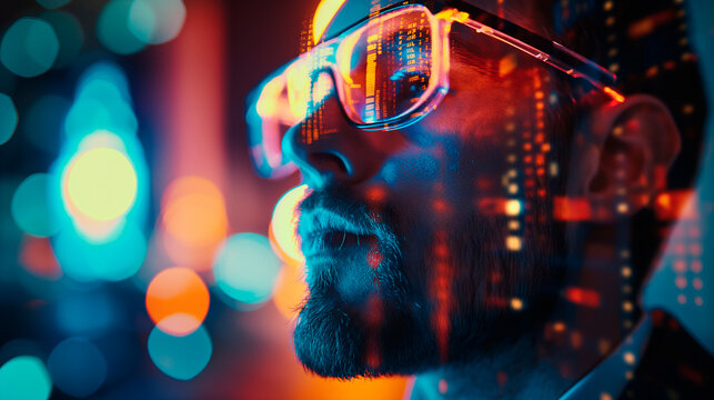 Mujer de negocios rodeada de flechas brillantes en un tono azul y verde vibrante, y gráficos futuristas con líneas atrevidas