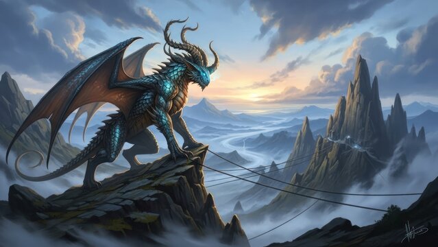 Majestic blue fantasy dragon stands on a rugged mountain peak overlooking a vast, misty valley at sunrise.