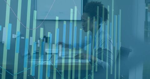 Businesswoman analyzing financial data using laptop with digital charts overlay in boardroom
