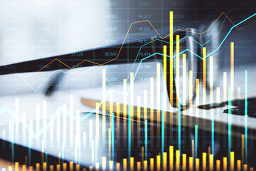 Financial charts and graphs overlaying a laptop screen on a desk.