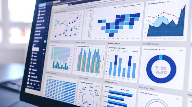 A laptop computer displaying graphs and charts on an electric blue dashboard