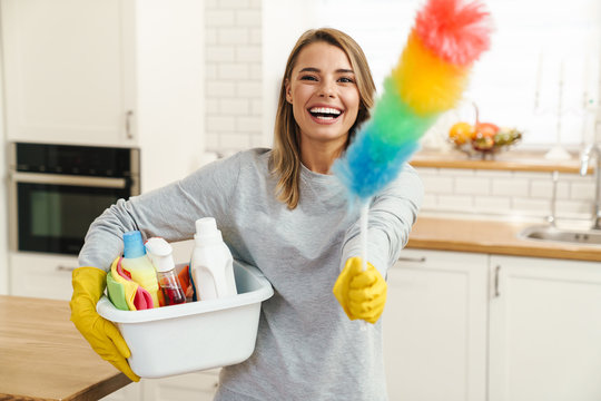 Friendly Young Charwoman Holding Accessories for Cleaning  -