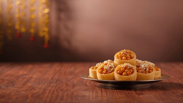 Indian street food featuring Panipuri or Golgappa filled with flavored water and chat ingredients, suitable as a colorful layout backdrop