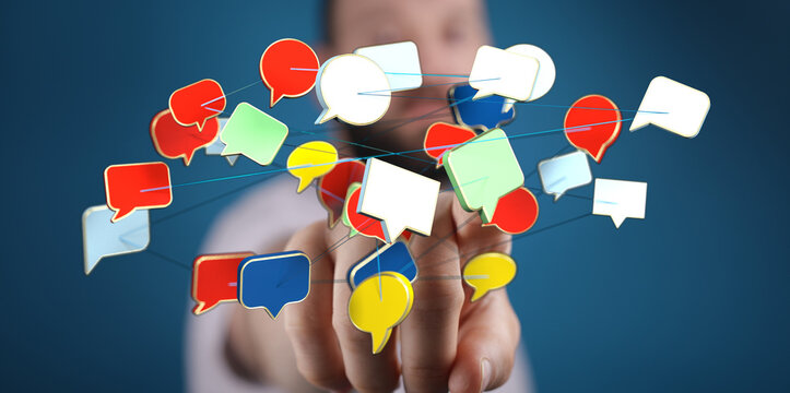 An abstract illustration featuring a hand touching a network of interconnected chat bubbles, symbolizing digital communication and online intera