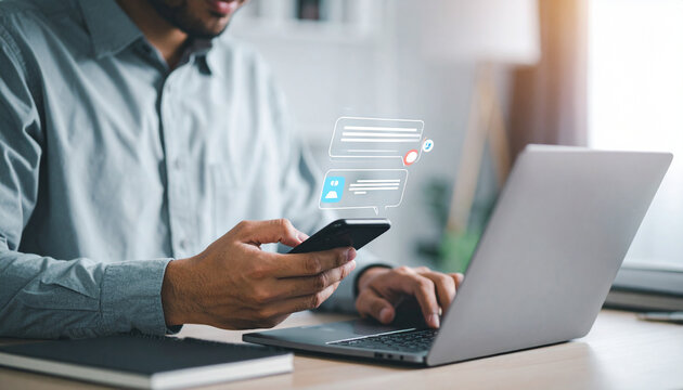 Man using smartphone with chat bubbles and laptop on desk representing online communication and digital interaction