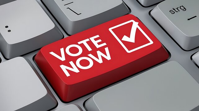 Close up of a keyboard with a red vote now key with a check mark in a box on the computer keyboard