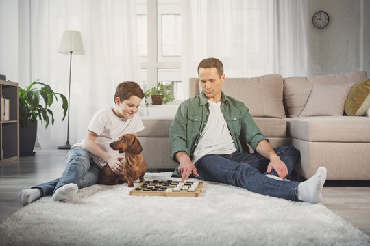 Pensive man is moving checker on board and smiling. His son is sitting near him on carpet and stroking the dog