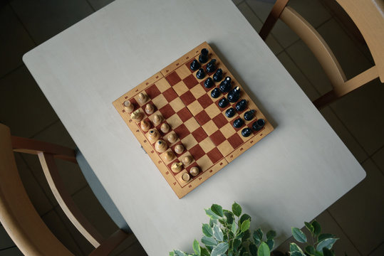 Student boy using a montessori checker board outdoors doing homeschooling.