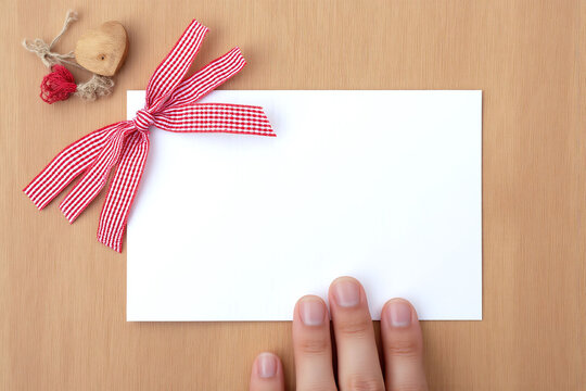 heart shaped card with a red and white checkered ribbon on a wooden table