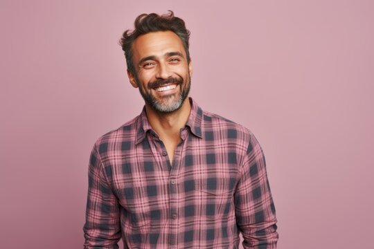 Portrait of a content man in his 40s wearing a comfy flannel shirt against a pastel or soft colors background. AI Generation