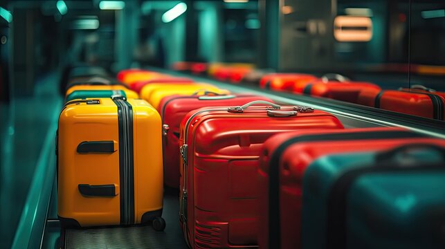 A row of suitcases on the baggage claim conveyor belt, each belonging to different travelers arriving at their destination.