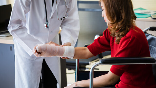 Close-up of man doctor of checking splint the arm of female patient hand due to with her arm broken for better healing with a smile sit in a wheelchair In the room hospital background.