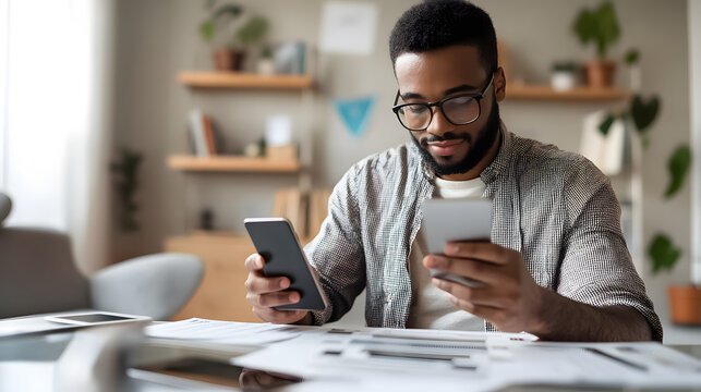 Mobile Microfinance – Man Using Banking App: A young man in a coffee shop checking his loan status on a mobile banking app, reflecting the accessibility of microfinance services.
