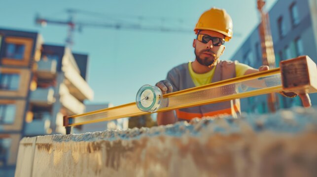 A construction site worker checking the measurements of a foundation. Featuring technical skill and focus