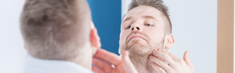 Movember concept with bearded man checking hair in mirror for men's health awareness