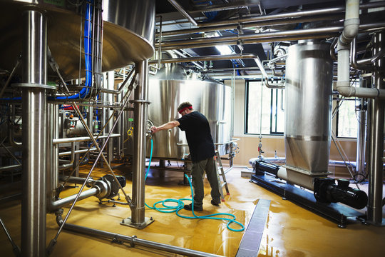 Man working in a brewery adjusting and checking the machinery which transfers the brewed beer around the processing plant.