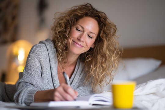 Young woman enjoying morning routine checking smartphone