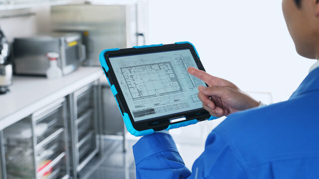 A worker checking the interior design on a tablet.
