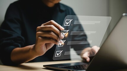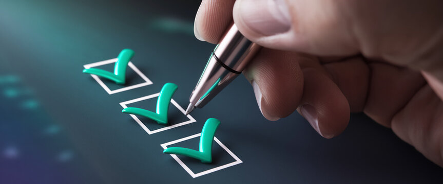 Close-up of hand checking items on checklist, green checkmarks on dark background, symbolizing completion, task management, or goal achievement