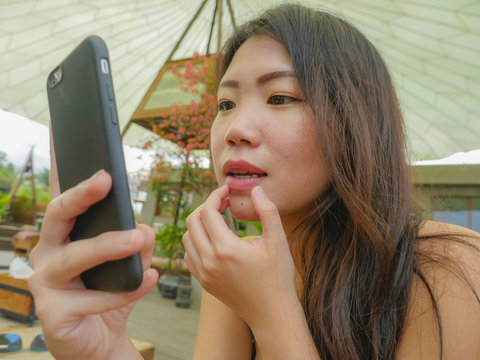 young beautiful and happy Asian Korean woman using mobile phone as mirror checking her make up enjoying relaxed outdoors at sweet coffee shop