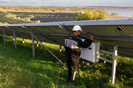 Electric company employee checking technical condition solar panels