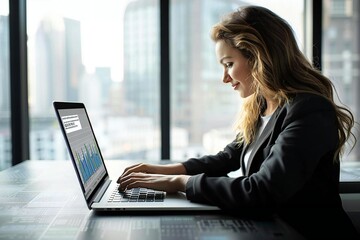 woman checking her credit score online for a business loan on her laptop with a financial background.