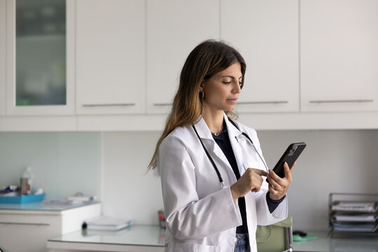 Happy millennial hispanic teen girl checking social media holding smartphone at home. Smiling young latin woman using mobile phone app playing game, shopping online, ordering delivery relax on sofa.