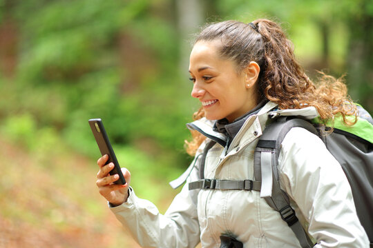 Diverse couple checking smartphone while hiking on hillside with shrubs and cloudy sky