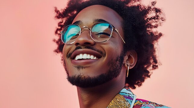 Entrepreneur smiling while checking real-time order statistics, isolated on a light coral background