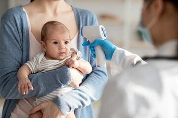 Pediatrician using infrared thermometer checking body temperature of baby boy
