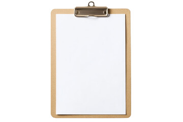 Top view of a brown clipboard with a blank white sheet of paper, isolated on a transparent background. Perfect for office or school use.