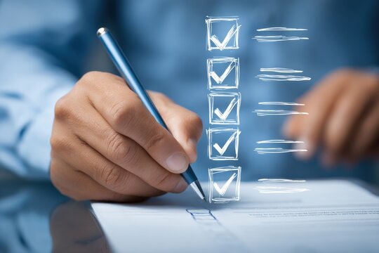 Businessman is checking off items on a virtual checklist, signifying completion of tasks or approval