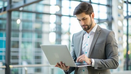 Professional reviewing analytics on dual monitors in bright open-plan office workspace