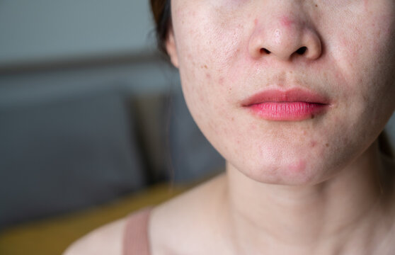Close-up smiling mid-adult woman showing natural skin texture, fine lines, brown eyes