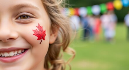 A child's smiling cheek painted with a maple leaf