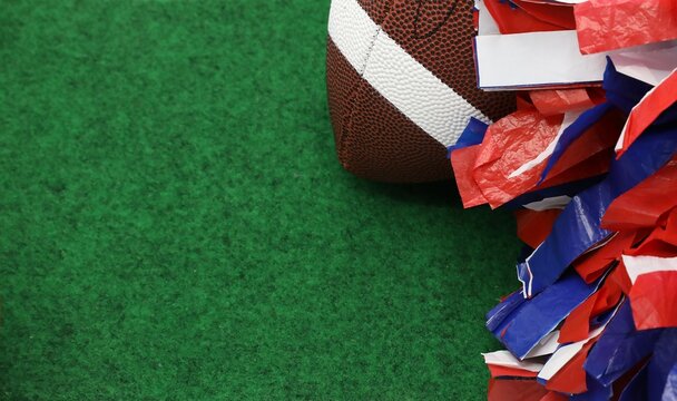 Close up of  golden and white pom pom in sharp focus with  blurred background of stadium lights and spectators