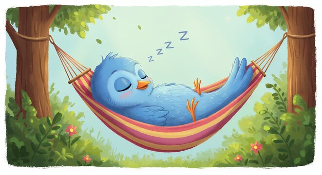 Sleeping bird resting in a hammock outdoors between trees daytime scene peaceful illustration