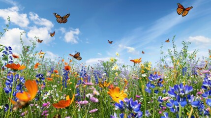A wildflower meadow in full bloom with a variety of colorful flowers, a clear blue sky above, and butterflies and bees buzzing around, creating a vibrant and cheerful natural scene perfect for a