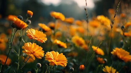 Field of vibrant yellow calendula flowers in full bloom with soft sunlight illuminating the petals in a cheerful and bright nature atmosphere.