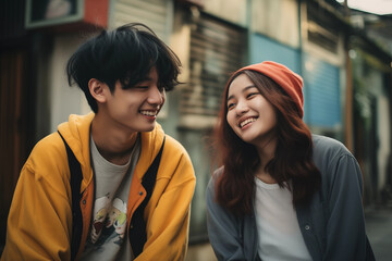 portrait of a couple outdoors, two asian teenagers laughing smiling, happy, white teeth, brown hair, in a street of a city, casual clothes, jackets with hood, complicity bond yellow friendship asia